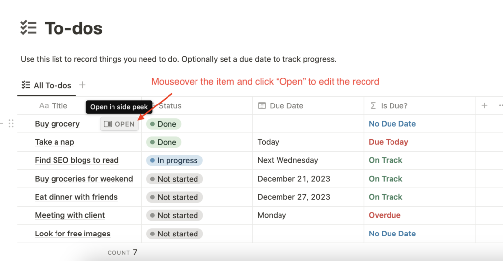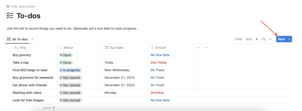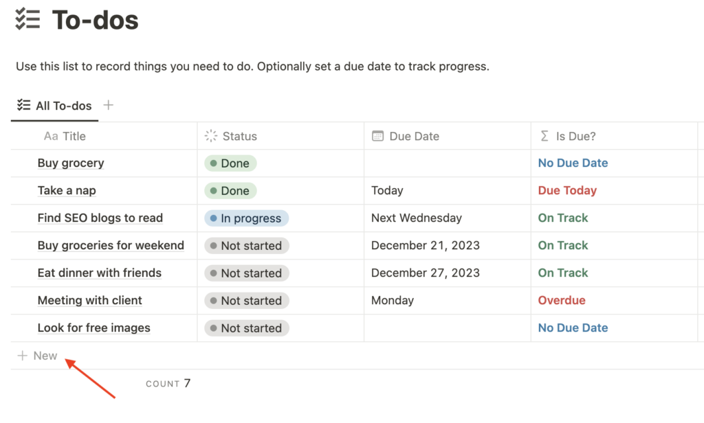 Alternatively, you can add a new record using the “+ New” button located at the bottom of the to-do list. Instead of the side panel, you will add a new record inline.