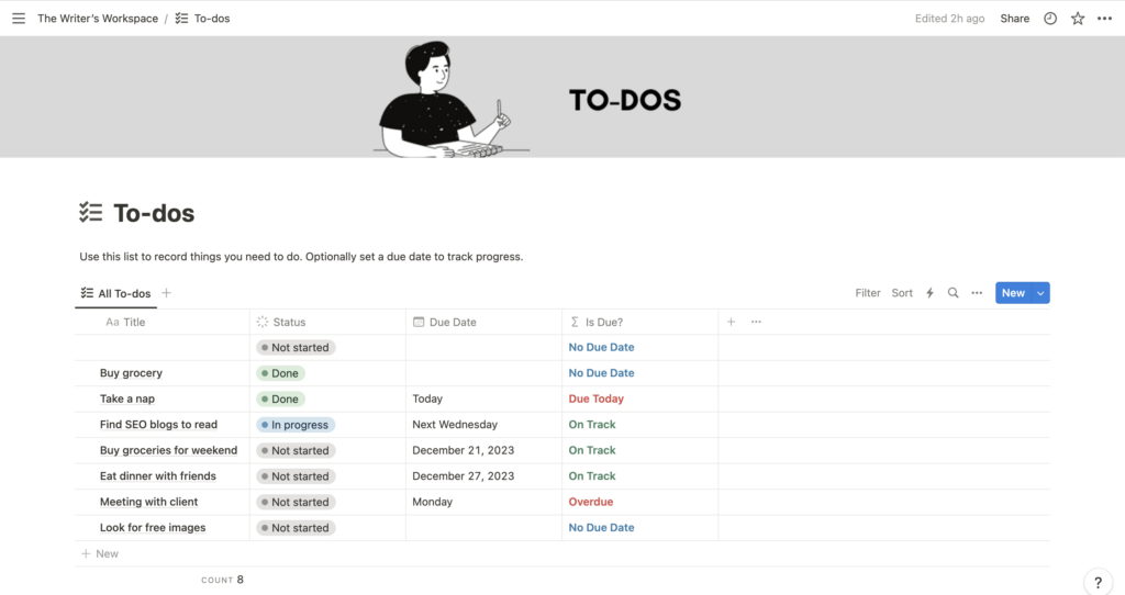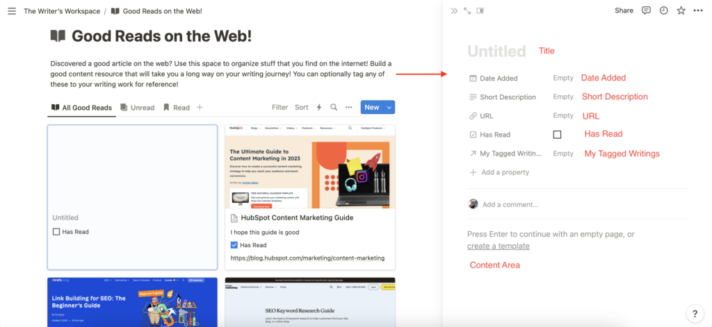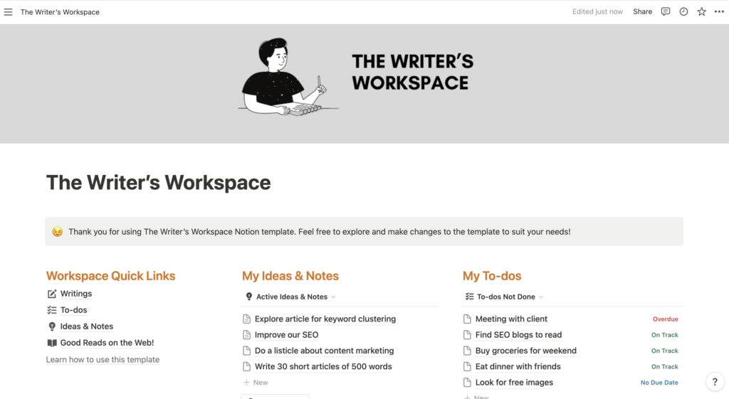 The Writer’s Workspace Notion template is a free Notion template created to help content writers manage their writing and research work more efficiently.