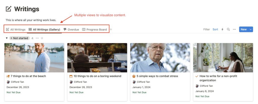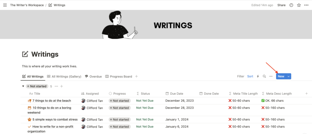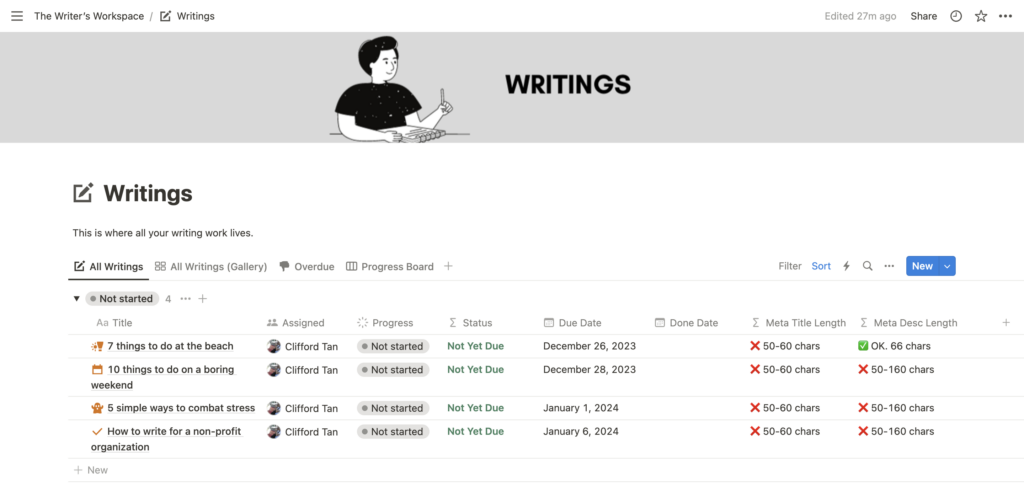 The Writings page comprises all your writing work. View and manage all article content and progress here.