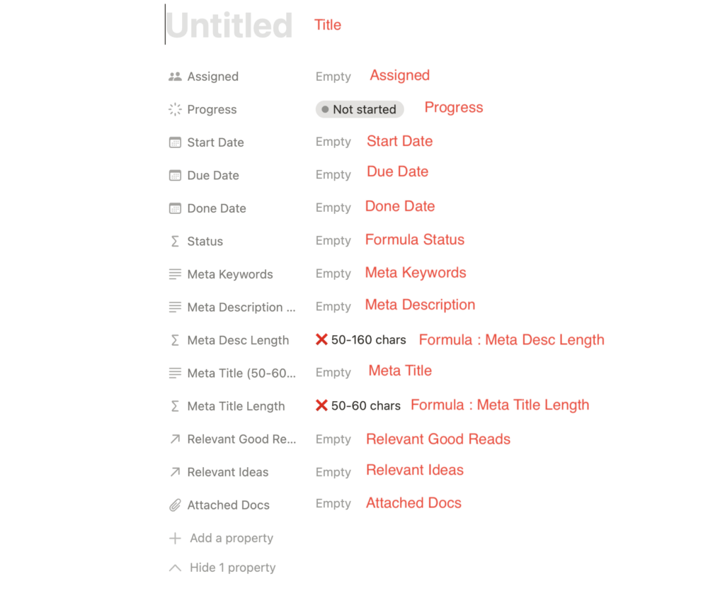 | Meta Title Length | This is a formula and requires no user input. It validates if the meta title length is within 50-60 characters. If so, a green check mark will appear. Otherwise, a red cross will appear. |