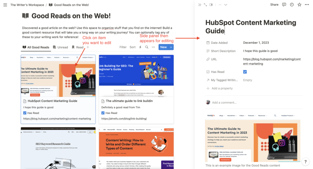 To edit an existing Good Reads item, just click on the item. You should see the item’s side panel appearing with the existing content loaded. Make changes to the necessary fields.